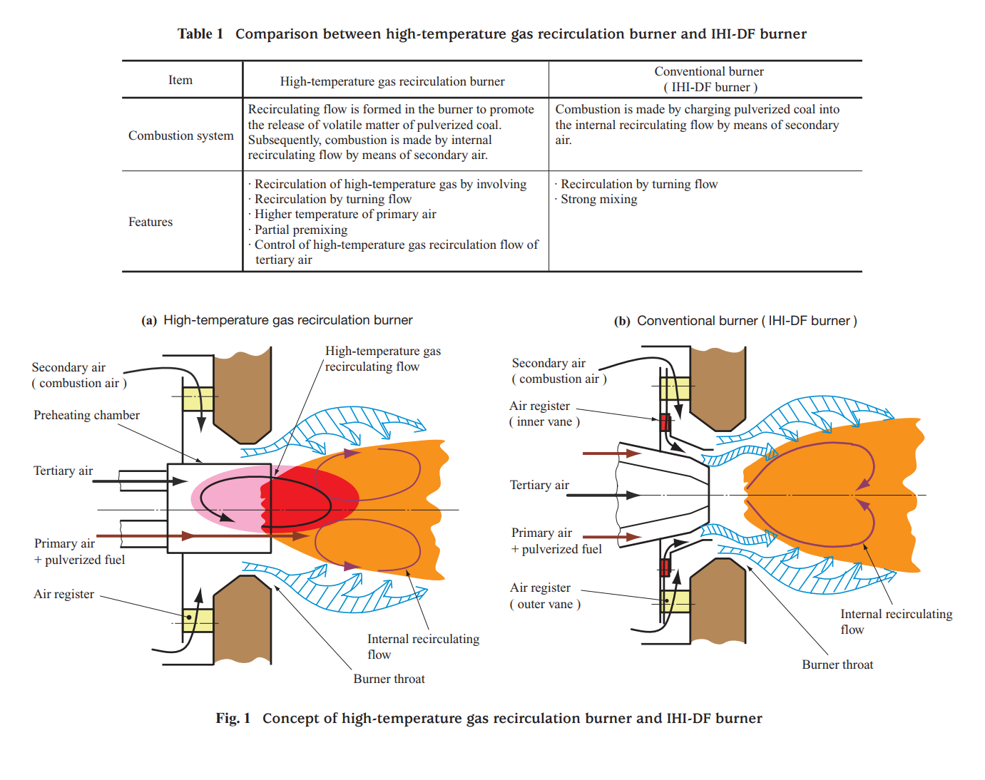 Table 1 shows a comparison of characteristics between the low-volatile coal-firing burner called high-temperature gas recirculation burner and the conventional burner ( IHI-DF burner ) and Fig. 1 shows the concept. The IHI-DF burner forms internal recirculating flow downstream of the burner by means of rotated combustion air ( secondary air ) and forms a stable flame by blowing the pulverized fuel in the recirculating flow.