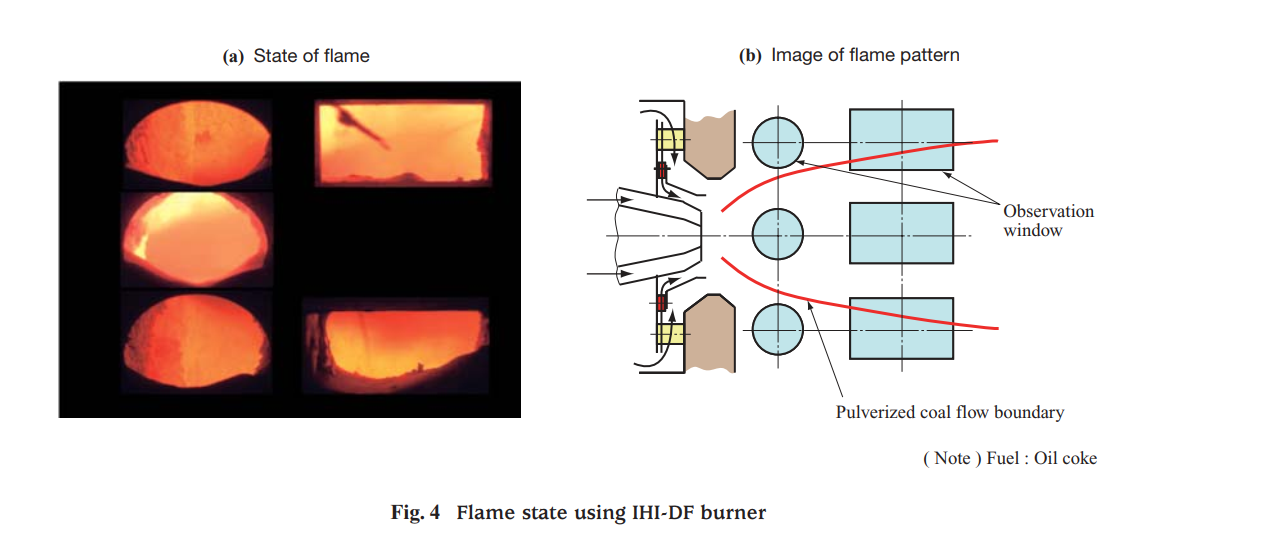 Figure 7 - (b) shows the measurement results when coal A ( anthracite ) was fired. The anthracite has less volatile content than oil coak and is difficult to burn. For this reason, the temperature distribution with the IHI-DF burner changes from 800˚C to about 900˚C from the burner throat to near the rear wall of the furnace, showing less combustion than the oil coke.