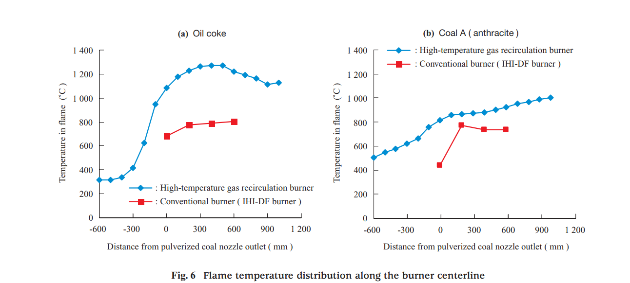 Figure 6 shows flame temperature distribution when oil coke ( -(a) ) and coal A ( anthracite ) ( -(b) ) are fired with the high-temperature gas recirculation burner and IHI-DF burner. The measurement was made by inserting thermocouples along the centerline of the burner. The results of both coal A ( anthracite ) and oil coke reveal that the temperature at the nozzle outlet portion of the high-temperature gas recirculation burner is 800˚C or higher, showing more stable ignition than the IHI-DF burner.