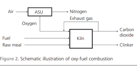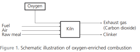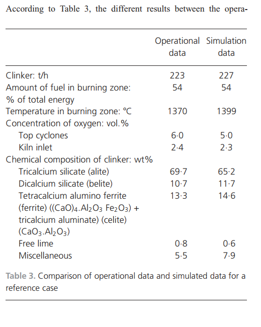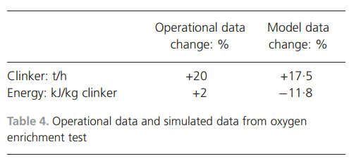 validated with reference operational data. It is further compared with a short full-scale operational oxygen-enriched air combustion test. The results describe how the process reacts to changes in combustion air, fuel input and raw meal addition because the model is able to provide detailed process data. The energy demand for oxygen production is not included in the calculations.Validation of process modelThe process model was validated with operational data from an industrial full-scale process during stable running conditions. Some operational results from normal running conditions are compared with the simulation results in Table 3.The amount of product is approximately 2% higher in the simulation model than in the operational data. This is because no particles are entrained in the gas phase in the simulation model. In the operational process, a non-negligible amount of dust is captured in the gas cleaning equipment. Furthermore, there is a small discrepancy in the burning zone temperature between the operational and simulated data. The temperature in the simulation model is an equilibrium temperature, meaning that the temperature is equal across all chemical phases. The operational data show the measured temperature of the solid material including solutions. The temperature of the gas phase is most likely higher in all parts of the system. Because the temperature of the solid phase in the process is of the utmost importance for the quality of the product, it is meaningful to use this as a basis for comparison. The higher oxygen concentration at the cyclones in the process compared with the model is due to less air leakage in the latter