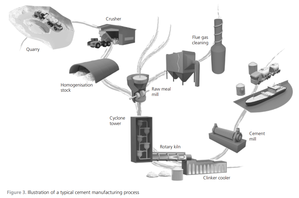 gas was added to the burning zone, the temperature would be very high. Balancing the temperature is necessary and is achieved by recirculating the exhaust gas back to the burning zone.Simulation toolsWhen introducing new raw materials, new fuels or new combustion technologies, much can be gained if there are simulation tools for predicting the outcomes of the changes. Full-scale industrial tests are very costly. Simulations will not replace fullscale tests, but the required number of tests might be reduced. The development of a simulation tool applicable to the cement kiln process is thus important.Models for the simulation of cement clinker manufacturing have been developed. Many of the works in the literature describe physical models that focus on flame characteristics, bed motion and heat transfer mechanisms. Some have used computational fluid dynamics (CFD) as the modelling tool (Mastorakos et al., 1999; Yuan et al., 2007) while mathematical equations of energy and mass conservation have been described and applied by others (Locher, 2002; Mujumdar et al., 2006). A chemical model has also been developed that focuses on the intrusion of alkali compounds in the ceramics in the kiln lining using non-equilibrium calculations (Emler, 2008). A steady-state chemical simulation model describing the thermodynamics and high-temperature chemistry of the cement process was presented by Ka¨a¨ntee et al. (2004), the focus of the work being the possibility of using alternative fuels in the cement process. An interesting model was developed by adding additional software and a more complete thermodynamic database to an Aspen Plus model by introducing Fact data (Yokota, 2004). The latter three models use adjustable parameters, which limits applications to specific plants and limited process variations in terms of process parameters. A process model that included plant-specific parameters of a cement plant using thermochemical data from Fact, where no mixed solution phases were included, was developed by Modigell et al. (2002). The linking of coupled chemical equilibrium reactors for modelling the alkali and sulfur chemistry in the cement kiln due to the utilisation of used tyres was explored. The model does not include the complete condensed-phase chemistry, but is a complete counter-current gas and material flow model (Enestam, 1998). A chemical model with a thermodynamic database and the possibility of including reaction kinetics and mass transfer between the bed and the gas phase was described by Pajarre and Penttila¨ (2004). Benefits of using phaseequilibrium calculations in cement clinkering reactions were also presented by Barry and Glasser (2000).Two groups of researchers have described the simulation of oxygen enrichment in cement rotary kilns. Both works focused on the flame and combustion characteristics, and both used CFD technology as a tool for showing the effects on flame temperature and shape and on combustion speed when using coal as fuel under increased oxygen concentrations (Manickam et al., 2009; Marin et al., 2001).The cement process and the developed thermodynamic process modelThe main characteristics of the cement manufacturing process are now described, along with the structure and details of the simulation model. The developed model is fully predictable with no adjustable parameters, which means that it is suitable for general use.Cement manufacturing processThe thermodynamic process model developed describes a modern dry-feed cement plant process with a double preheater system with calciners. The primary fuels are coal and petroleum coke. Used car tyres are used as an alternative fuel in the calciners along with coal and petroleum coke. The manufacture of cement involves several physical operations and chemical reactions. Figure 3 illustrates the whole chain, from the quarrying of raw material to the end product cement ready for delivery to the customer. After the raw meal has been quarried, it is crushed, ground and fed into the process at the top of the cyclone tower. The process continues with the material being preheated in the cyclones and calciners, entering the riser duct and flowing into the rotary kiln. After reaching the maximum temperature at the lower end of the rotary kiln, the clinker is cooled in a clinker cooler.One of the main chemical reactions taking place is calcination by removing carbon dioxide from the carbonaceous material. This endothermic reaction consumes energy. In a system with preheating, the calcination is, to a large extent, completed before the material enters the rotary kiln.The air feed into the process moves in the opposite direction to the material. Air is either added as primary air with the fuel to the main burner at the lower end of the rotary kiln or as secondary air for cooling the clinker. The gas leaves the process as exhaust gas at the top of the cyclones, cools in the cooling tower and is de-dusted in bag filters.Simulation modelThe simulation model simulates the part of the process where chemical reactions take place. In Figure 4, the model shows the cyclone, preheater, rotary kiln and clinker cooler. The process model comprises two commercial software programs, Aspen Plus and Chemapp. The process scheme is drawn in Aspen Plus and the