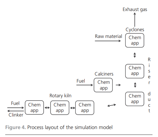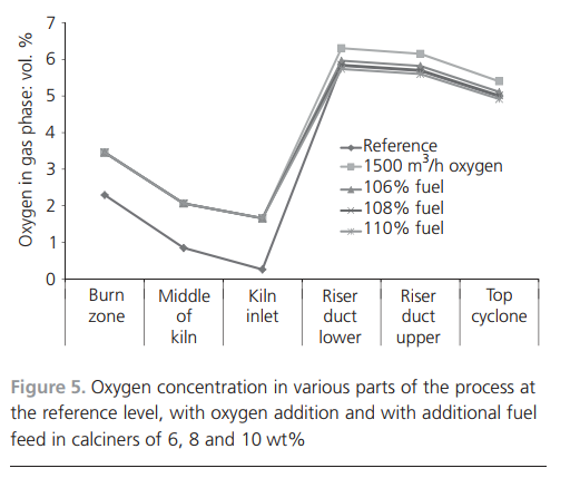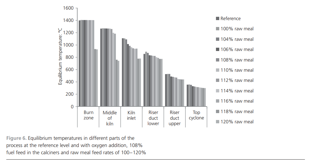 tional and simulated clinker compositions are partly due to the different methods used to determine the clinker minerals. The operational data are from the evaluation of etched clinker minerals using microscopy, whereas the simulated clinker quality is determined by calculating the equilibrium condensed product at the maximum temperature using a Scheil–Gulliver cooling procedure (Bale et al., 2009).Operational and simulation results from oxygenenriched air combustionFull-scale tests with oxygen-enriched air were performed with 1500 m3/h oxygen (95 vol.% oxygen, 160 kPa) added to the primary air. The test aimed to increase clinker production by introducing oxygen, which would improve fuel combustion and, at the same time, allow possibilities for increasing the fuel feed rate. Extra fuel was added in the calciners. The full-scale test was of short duration and therefore simulations were performed to locate the operational steady state not achieved during the full-scale test. The simulated oxygen enrichment test was performed by adding the same amount of oxygen to the primary air as in the test. The extra oxygen in the process was utilised to combust additional fuel. The amount of fuel added to reach the reference-level oxygen concentration was simulated iteratively. The increased temperature resulting from the extra added fuel was then utilised to add more raw meal. Compared with the reference case, the simulations considered 106%, 108% and 110% of fuel in the calciners.The oxygen concentrations resulting from the simulations are shown in Figure 5. Approximately 108% fuel addition to the calciners (compared with the reference case) yielded similar levels of oxygen in the riser and top cyclones. In all simulations, compared with the reference case, the oxygen concentrationswere higher in the burn zone and the middle and inlet of the rotary kiln. This is because no additional combustion occurs in the burn zone because the fuel rate in this part is kept constant. The gas from the calciners will not reach the rotary kiln because that is in the opposite direction to the gas path. The outcome of this iteration is that it is possible to add 108% fuel in the calciners at this oxygen level.Increasing the amount of fuel yields higher temperatures in the process. The increased temperature is utilised to add more raw meal, which enables more endothermic reactions to take place. Simulations were performed with up to 120% of the raw meal feed rate compared with the reference case; the results are shown in Figure 6. When increasing the raw meal feed rate, more energy is