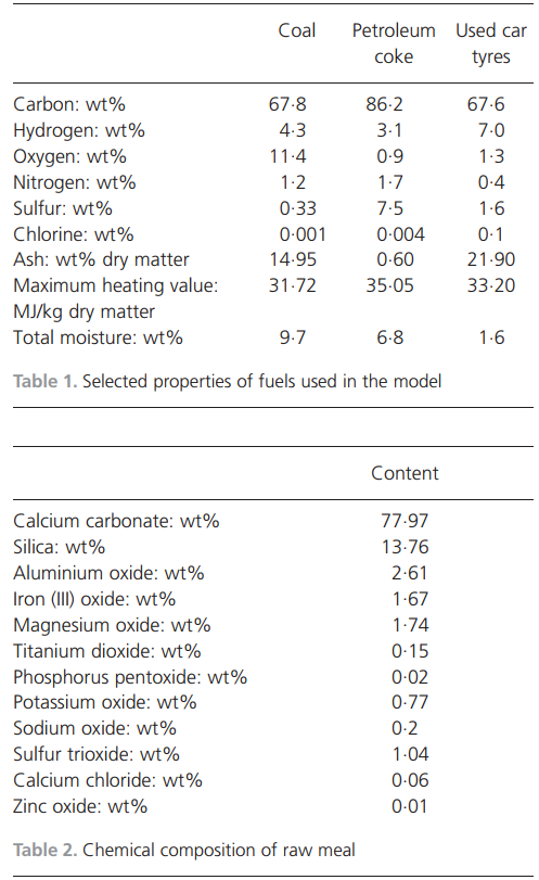 iteration procedure continues until it reaches a mass and energy balance. The calculation blocks are placed in the process scheme with Chemapp algorithms wherever chemical equilibrium calculations are necessary. In the model, these are selected to calculate the chemistry in the cyclones, calciners, upper and lower riser ducts, rotary kiln inlet, middle of the kiln and the burning zone.The model described in this paper is a continuation of one previously developed by Ka¨a¨ntee et al. (2004). The model was further developed with a unique fuel definition and use of Chemapp software. It was verified for a cement plant (Wilhelmsson-Ho¨kfors et al., 2008). Further developments were then made, as described by Ho¨kfors et al. (2012). This time, the model was applied to and verified for a lime rotary kiln. The database was extended to include the solution phases and a non-equilibrium cooling method for the product. The simulation results were compared and verified with full-scale data for the lime manufacturing plant. The model is an idealised model in the sense that it functions in a completely counter-current flow mode with gas moving in one direction and condensed material travelling in the opposite direction. No kinetic factors are considered and chemical equilibrium is reached in every Chemapp block. Calculation of chemical equilibrium for an ideal system involves minimising the Gibbs free energy by optimisation. This implies, for example, that the heat transfer between all involved phases is complete and their temperatures are identical.The thermodynamic database contains 16 system components (Ca, Si, Al, Fe, Mg, C, H, O, N, K, Na, S, Cl, P, Ti and Zn), one gas phase, two pure liquids (water and calcium sulfate), 173 pure solid phases and nine solution phases. There are two liquid solution phases – an oxide melt with CaO, SiO2, Al2O3, Fe2O3, MgO, FeO, TiO2, Ti2O3, ZnO, K2O, Na2O, CaSO4 and Ca3(PO4)2 and a salt melt with KCl, NaCl, Na2SO4, K2SO4, Na2CO3, K2CO3 and CaSO4: The other solution phases are solid solutions, such as calcium aluminate ferrites, alkali salts and calcium titanium oxides. The thermodynamic data are from Fact.The fuels are defined uniquely by their chemical compositions and calorimetric heating values, as described by Wilhelmsson-Ho¨kfors et al. (2008). The properties of the fuels used in the model are shown in Table 1. Coal and petroleum coke are used in the burn zone and in the calciners. Used car tyres are added in the calciners. Table 2 lists the compositions of the raw materials fed into the process.Temperatures in the model are enthalpy controlled. It is also possible to specify the temperature in each Chemapp block, but it is necessary to use enthalpy-steered calculations to predict how the process changes influence the temperature.ResultsThe results described are from the simulation model. Because the model has been subjected to improvement, it is first compared and