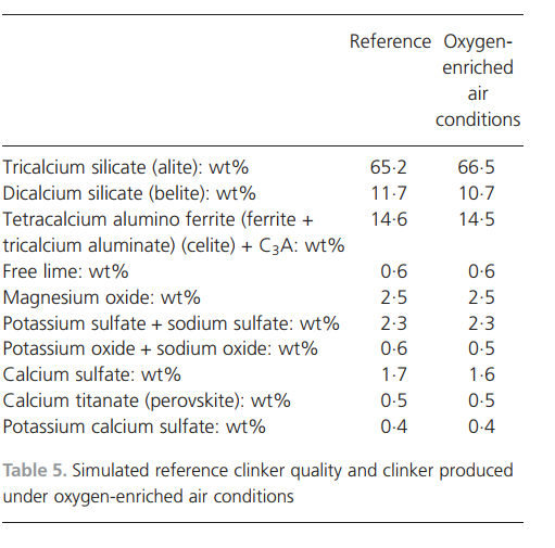 11.8% per kilogramme of clinker produced. One reason for the decreased specific energy consumption is that the process becomes more energy efficient because the temperature of the gas leaving the process is lower in the oxygen enrichment test than in the reference case: 3058C compared with 3568C.The quality of the clinker produced from the full-scale oxygen enrichment test was evaluated using microscopy. Compared with the reference clinker, the quality was unaffected. The simulated clinker quality from the reference case and the clinker produced with oxygen-enriched air optimised with fuel and raw meal addition are compared in Table 5. There are changes in theamounts of C3S ((CaO)3.SiO2 (alite)) and C2S ((CaO)2.SiO2 (belite)) – alite increases by 1.3% and belite decreases by 1.0%. In total, the change of alite and belite is only 0.3%. Sodium oxide, together with potassium oxide and calcium sulfate decreases by 0.1%. The changes are due to the smaller amount of fuel and, consequently, less fuel ash is produced per tonne of clinker produced.The chemical composition of clinker is predicted with a high level of detail by the simulation model. Simulations were performed to determine how increased oxygen enrichment influences clinker quality. The addition of oxygen was tripled compared with the full-scale oxygen enrichment test; all other parameters were kept constant to exclusively evaluate the oxygen addition. The addition of oxygen gas changed the temperature in the process only slightly. The quality of clinker was unaffected by the addition of oxygen up to 4500 m3/h without changing the fuel and raw meal feed rates.ConclusionsThe process model developed for application to cement manufacturing processes adequately predicted a full-scale reference case